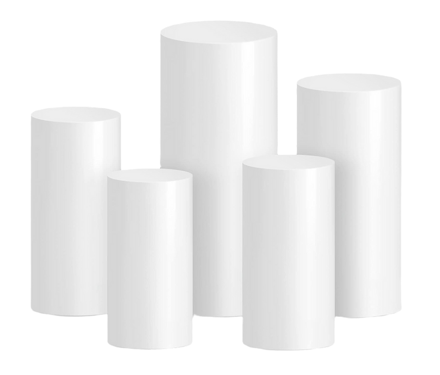 Decor Metal PedestalsWhite $15 each / $60 set of 5 Cloth NapkinsWhite $0.75 each Cloth NapkinsTurquoise $0.75 each Charger PlatesSilver $0.50 each Clear Glass Vases$2 each